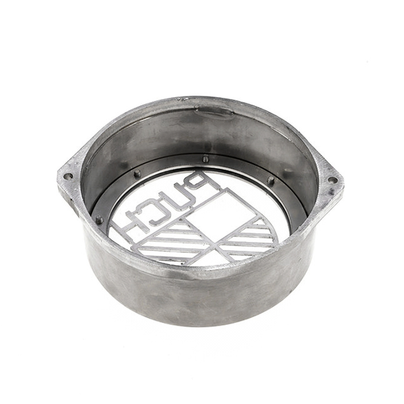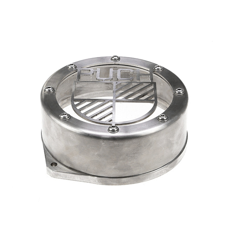 Couvercle de volant d’inertie en acier inoxydable avec verre de regard en polycarbonate.
