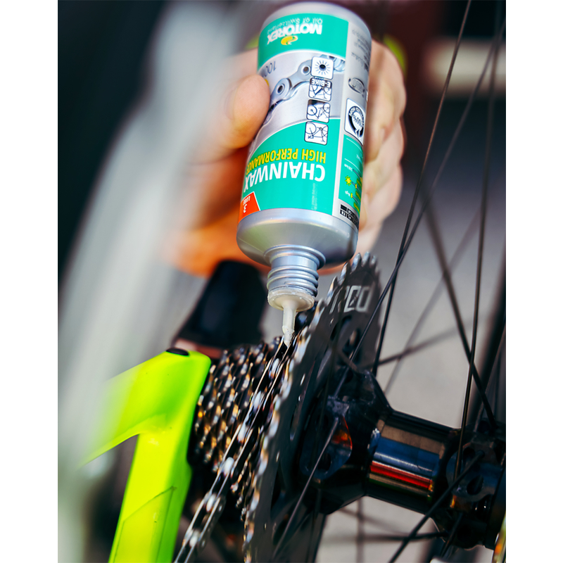 Avant la première application, le système d’entraînement (cassette, chaîne, dérailleur, pignon) doit être totalement exempt de graisse et être sec. Il faut aussi absolument nettoyer minutieusement les chaînes neuves avec du MOTOREX BIKE CHAIN DEGREASER. Toujours bien secouer MOTOREX CHAINWAX avant l’utilisation. Appliquer ensuite sur la chaîne sèche à l’intérieur et à l’extérieur. Température d’utilisation supérieure à 5 °C dans l’idéal. La chaîne peut ensuite être relubrifiée plusieurs fois sans autre nettoyage.