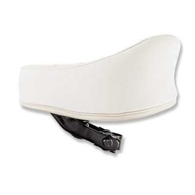 Selle au look original des anciens modèles Maxi N et 2 vitesses, recouverte de cuir blanc. La selle a une belle finition et porte l’inscription « PUCH » en noir à l’arrière.