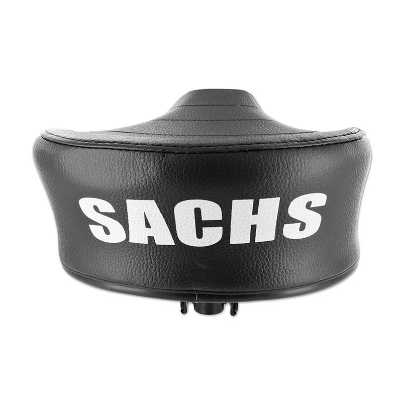 Selle au look original des anciennes mobylettes Sachs avec l’inscription « SACHS ».