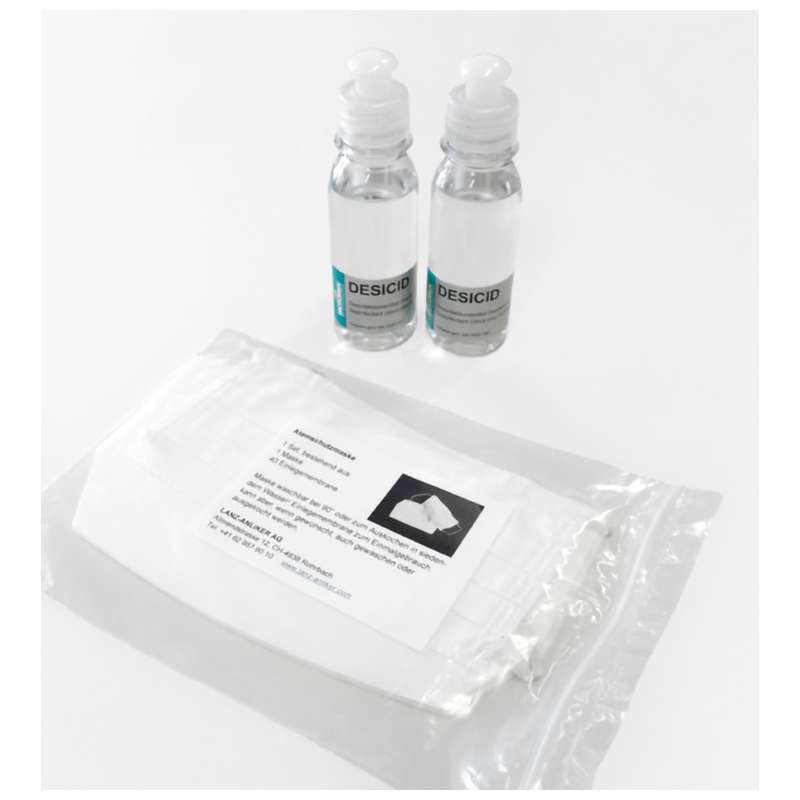 – 2 x 100ml de désinfectant pour les mains compatibles avec la peau Desicid : Très efficace contre les virus (virus CORONA) et les bactéries. Particulièrement doux pour la peau, car il contient de la glycérine. OFSP BBI 2020 1561.